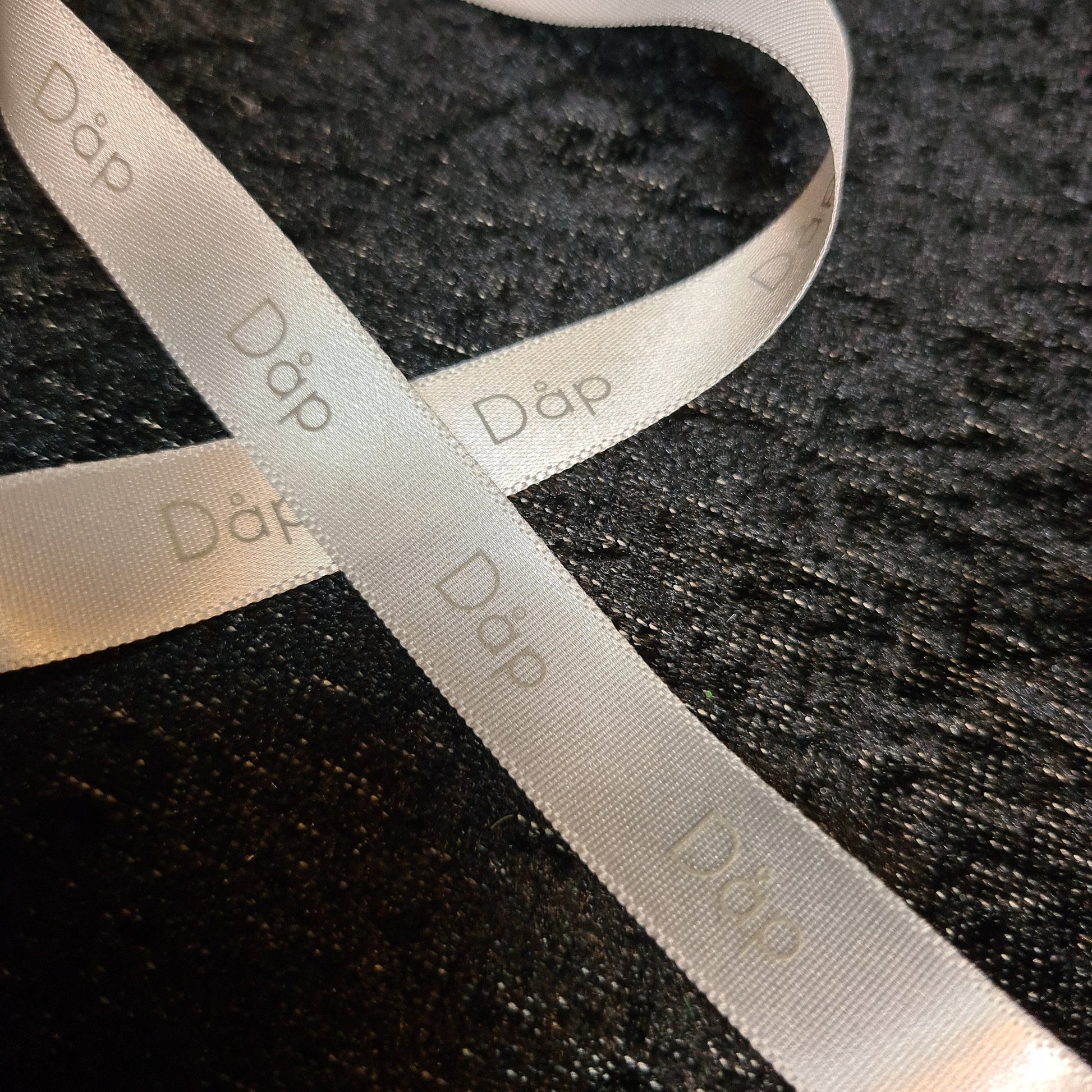 Bånd med tekst «Dåp» hvitt med grå skrift, bredde: 13mm. Pris pr meter.
