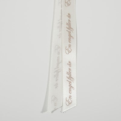 Nydelig kremfarget silkebånd med beige farget tekst " En engel fyller år " 13mm.