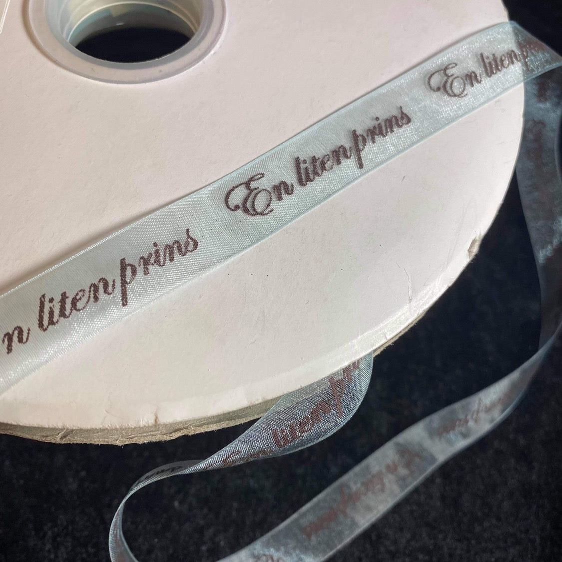 Bånd med tekst «En liten prins», sheerbånd lysblått m/svart tekst . 16mm