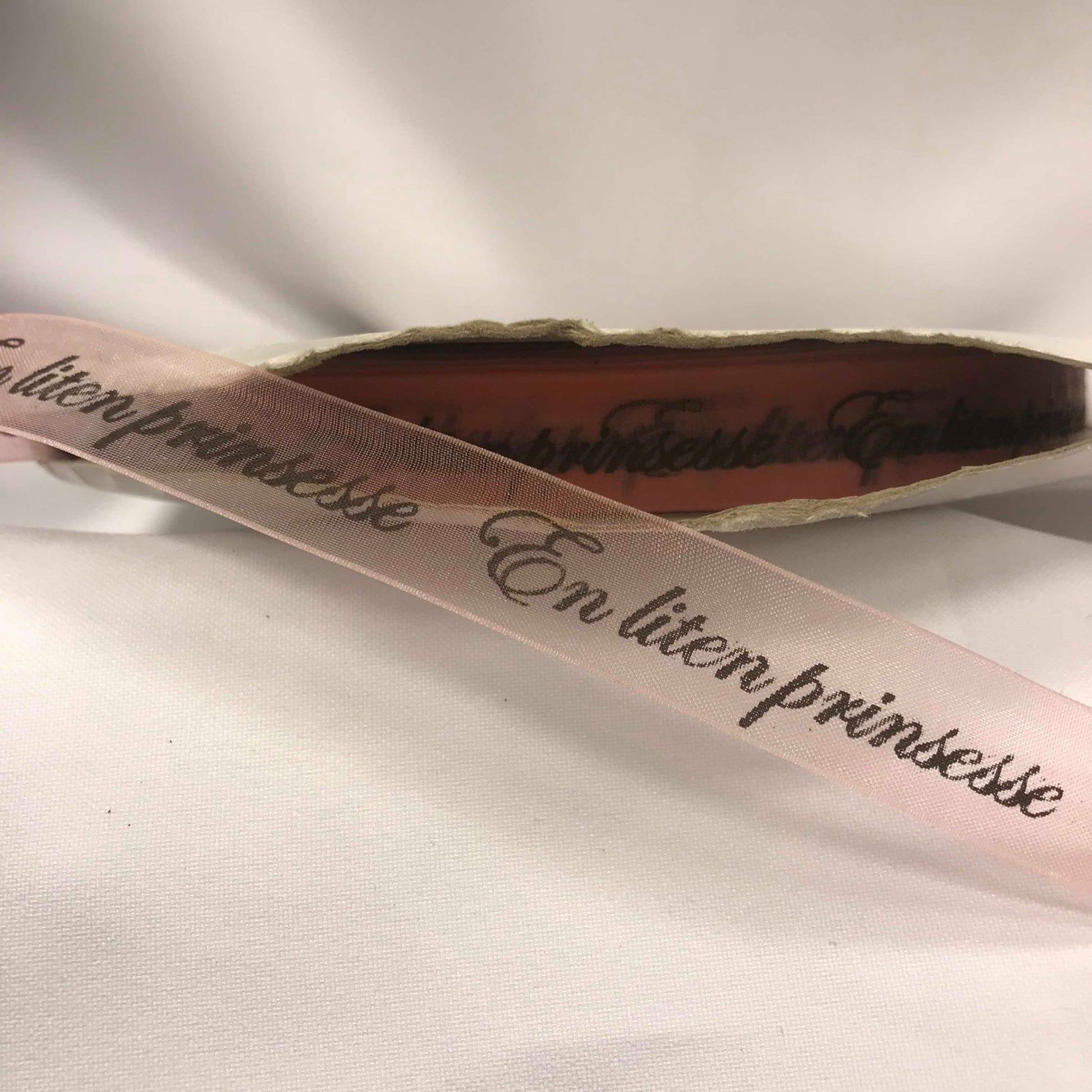 Bånd med tekst «En liten prinsesse», lys rosa sheerbånd med svart skrift. 16mm bredde.