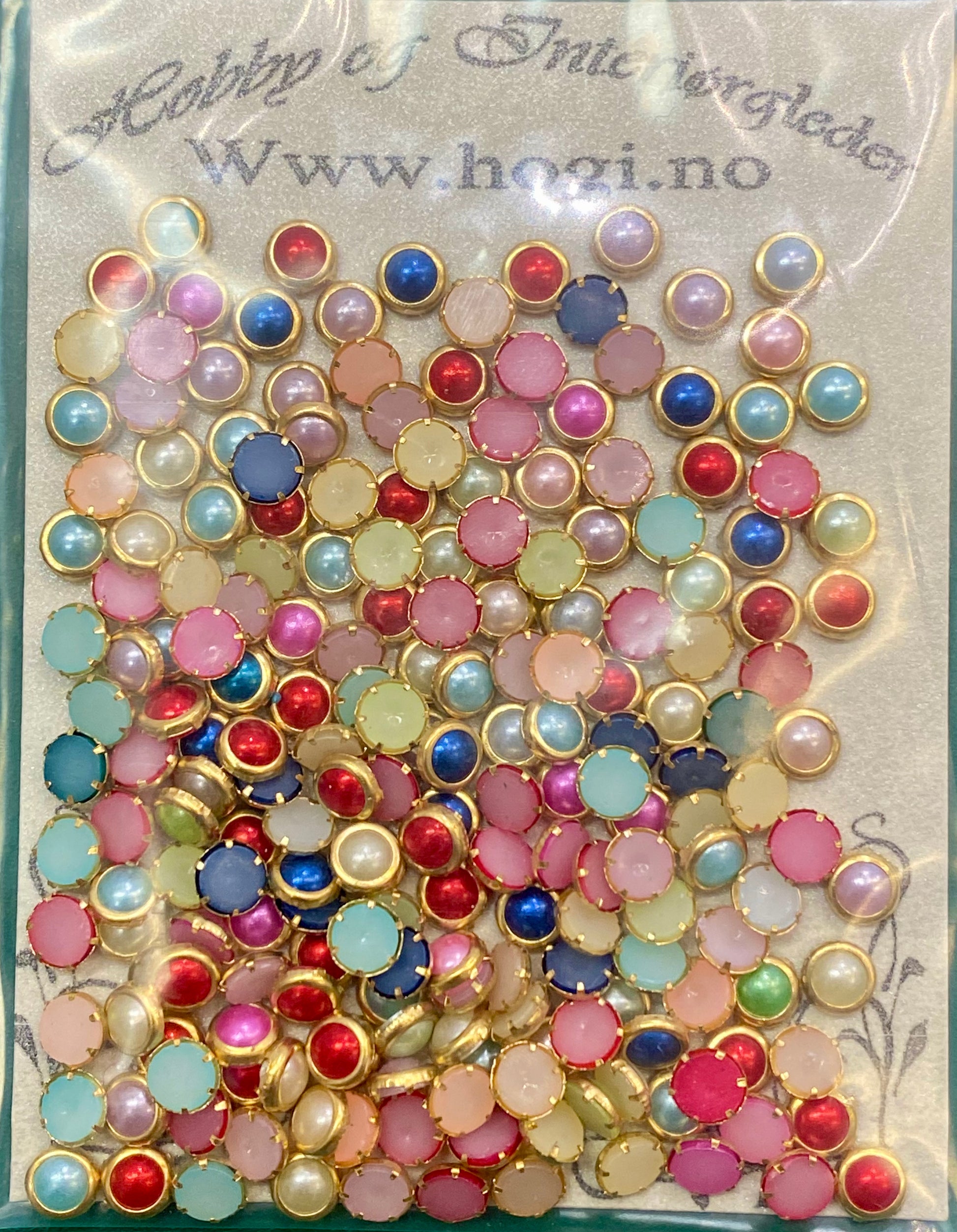 Flotte små halvperler i mange flottefarger. Hver halvperle er i gullomramning. Materiale: plast.