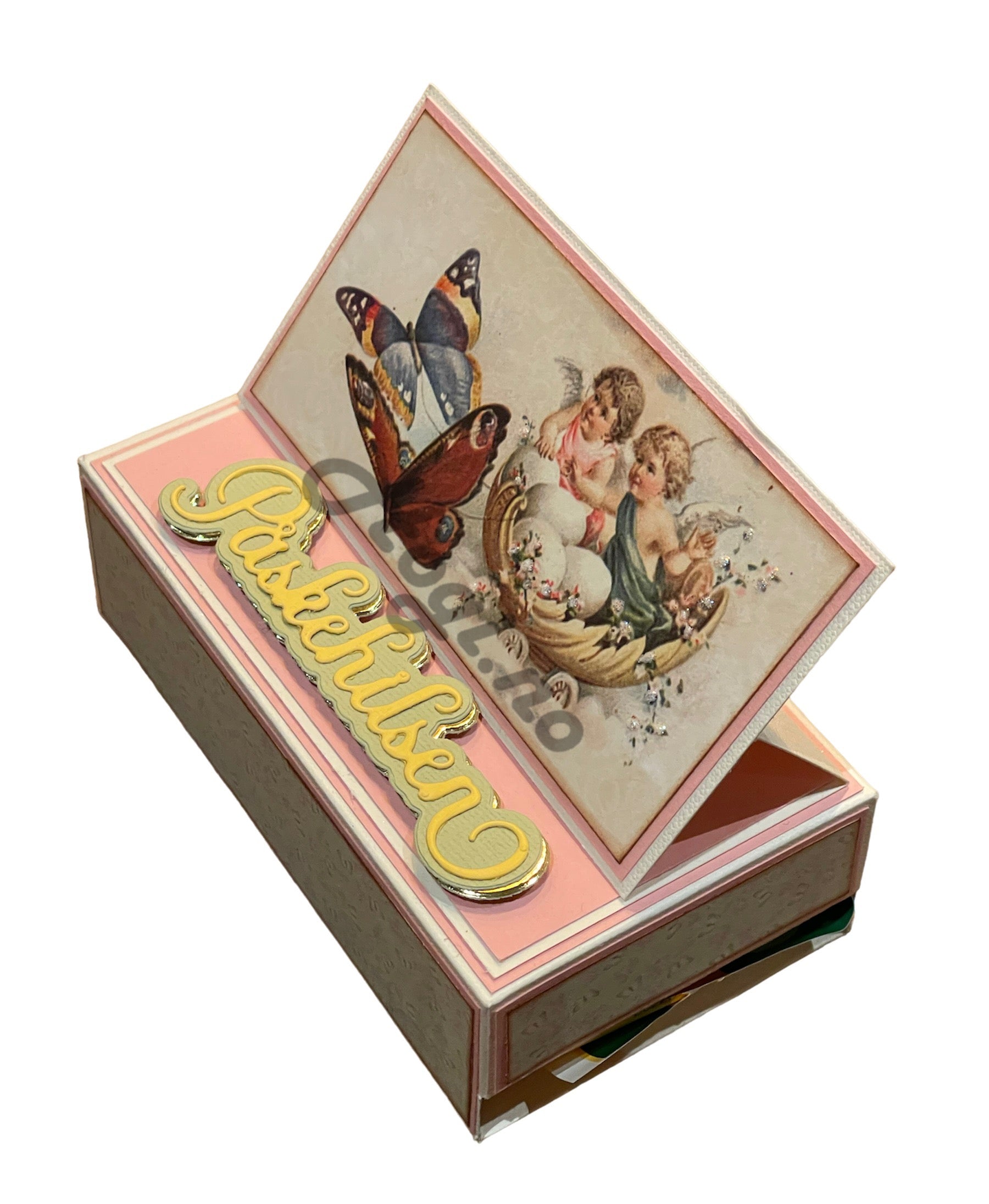 Denne svært smarte og praktiske gaveesken er en super gave/ oppmerksomhet å gi bort. Utgaven vi viser deg her er laget i tema PÅSKE, men den kan selvsagt tilpasses enhver anledning.
