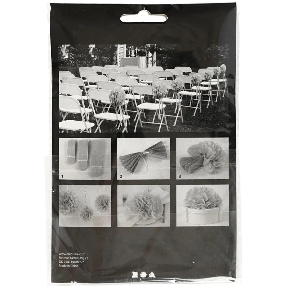 Luftige pomponer av silkepapir. Brettes ut til runde kuler og knytes med snoren som hører til. Pk. med 3 størrelser.