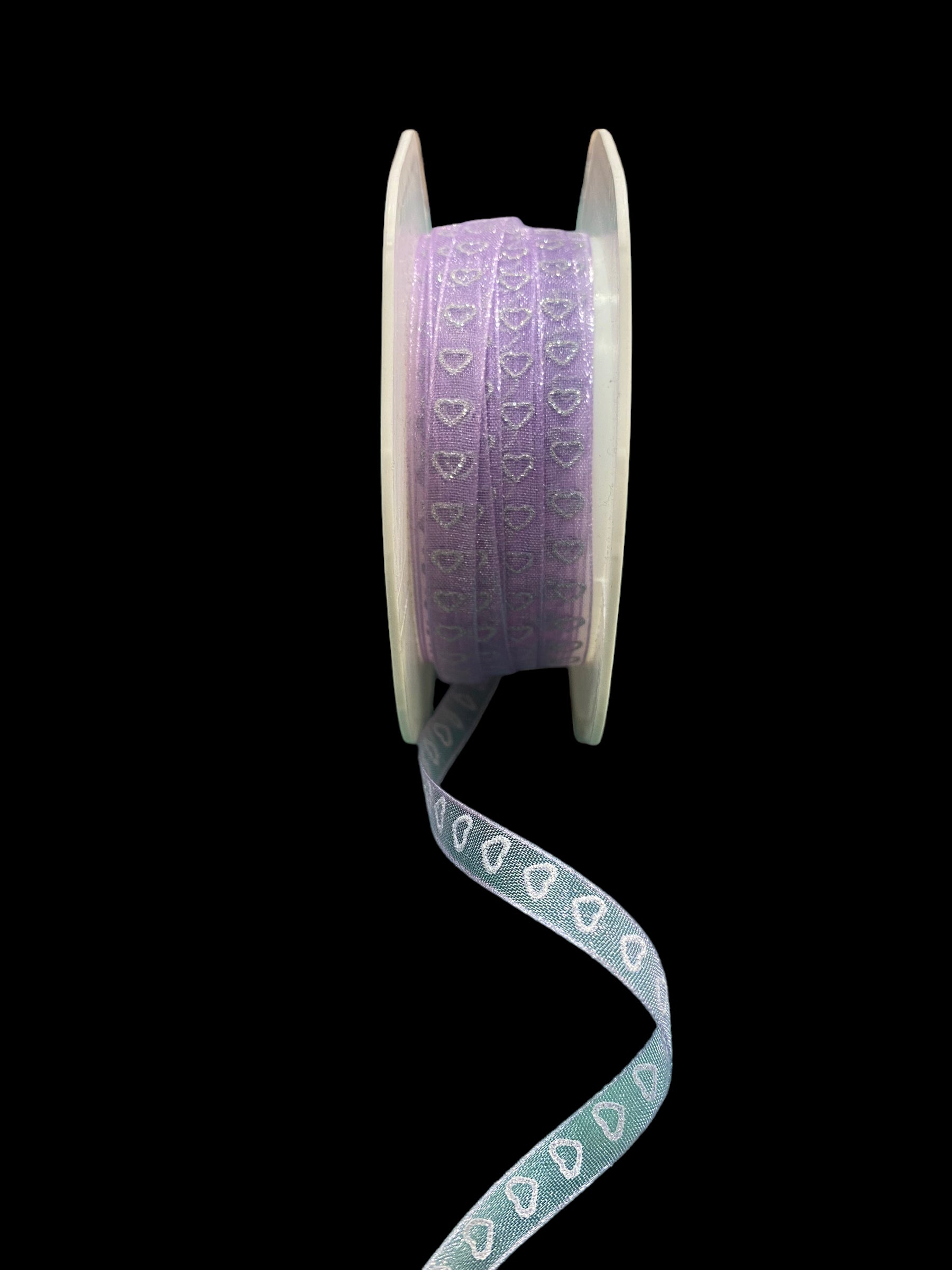 Sheerbånd - lys lilla shimmerbånd med glitterhjerter sølv. 7mm