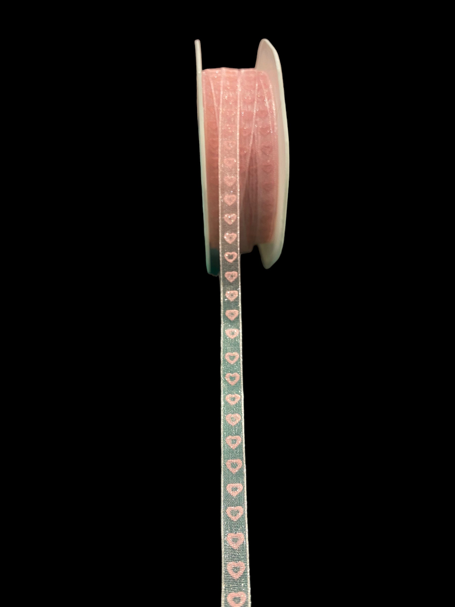 Sheerbånd - lys rosa shimmerbånd med glitterhjerter sølv. 7mm