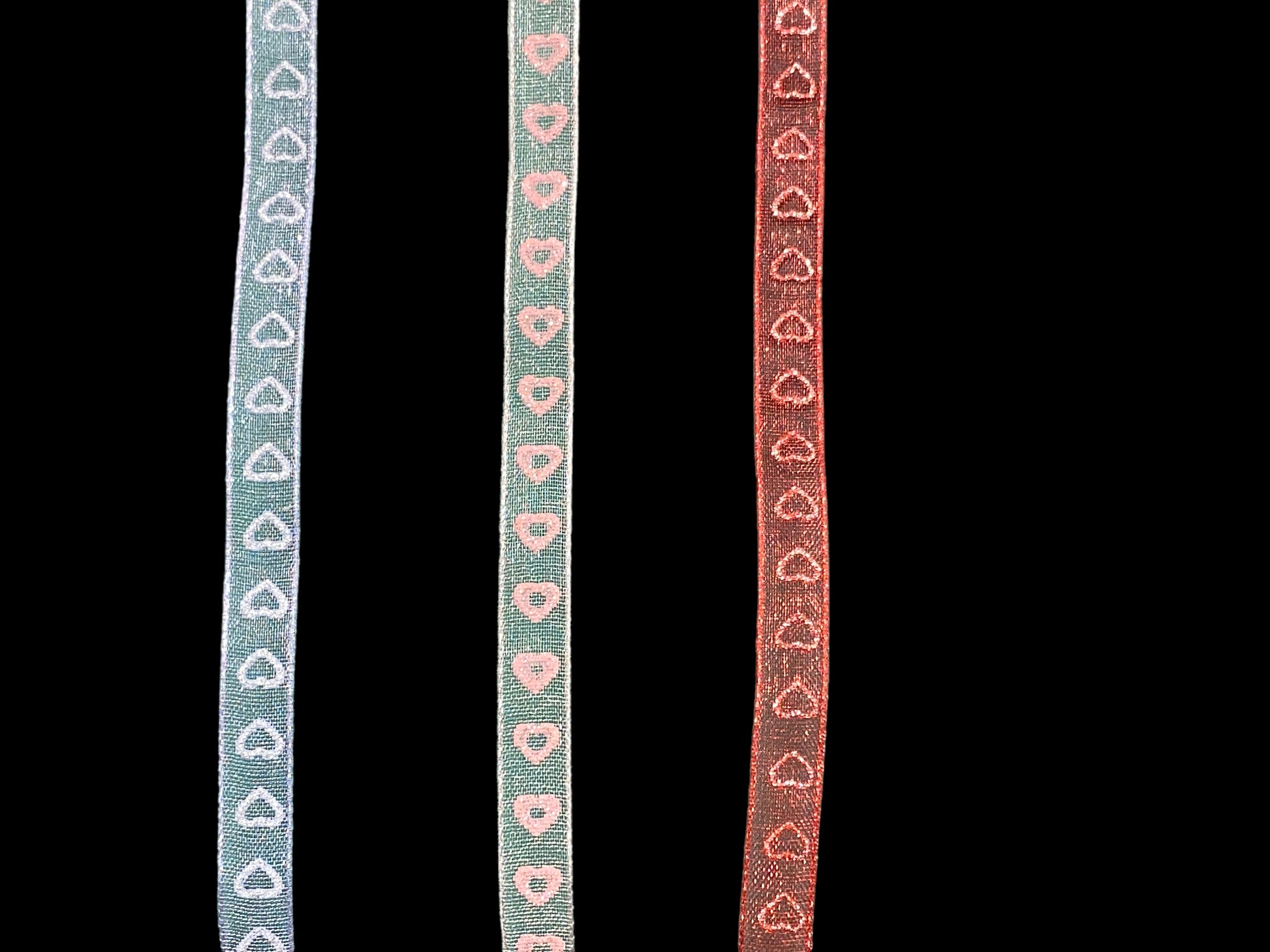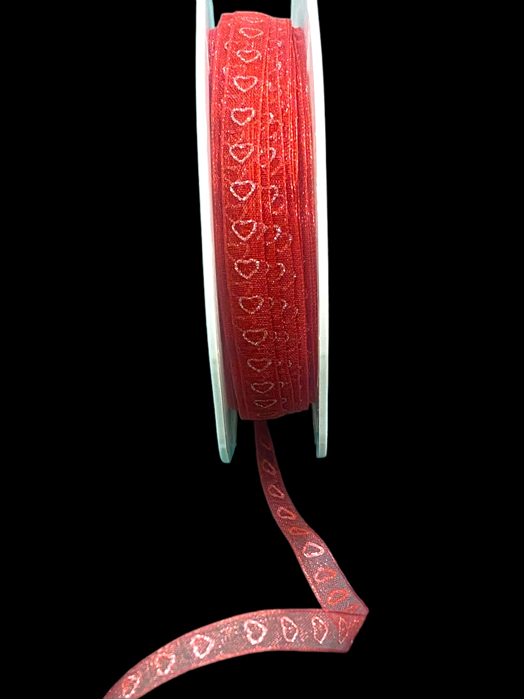 Sheerbånd - Rødt shimmerbånd med glitterhjerter sølv. 7mm