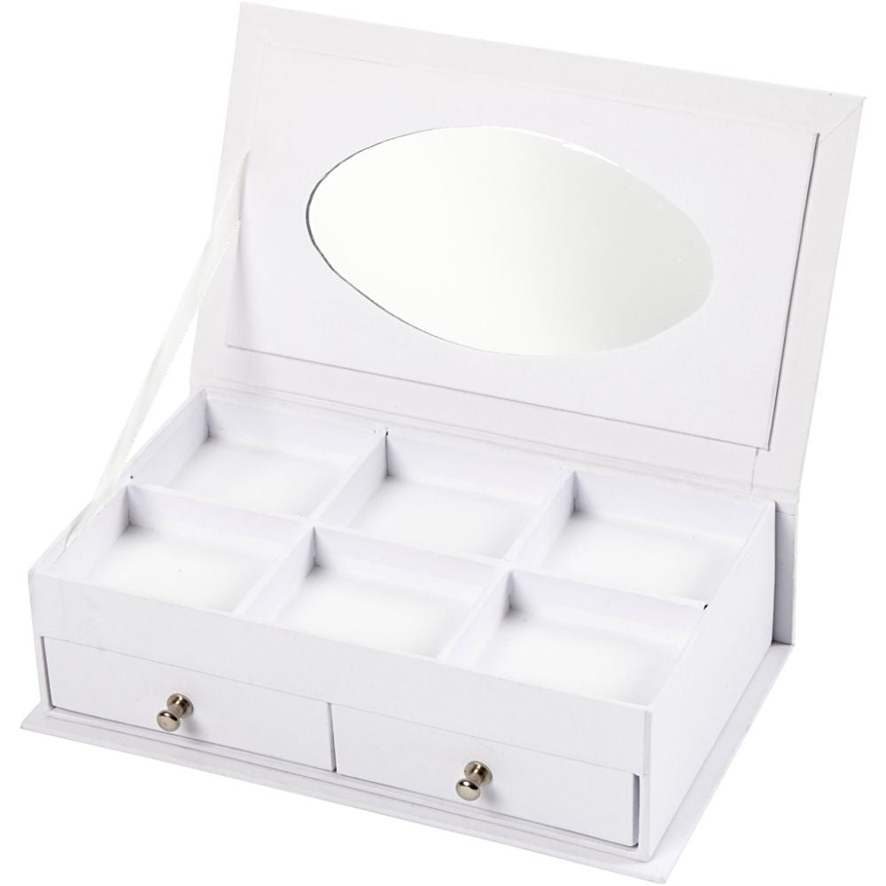 Skrinet består av 2 skuffer nederst, 6 rominndelinger øverst samt speil på baksiden av lokket