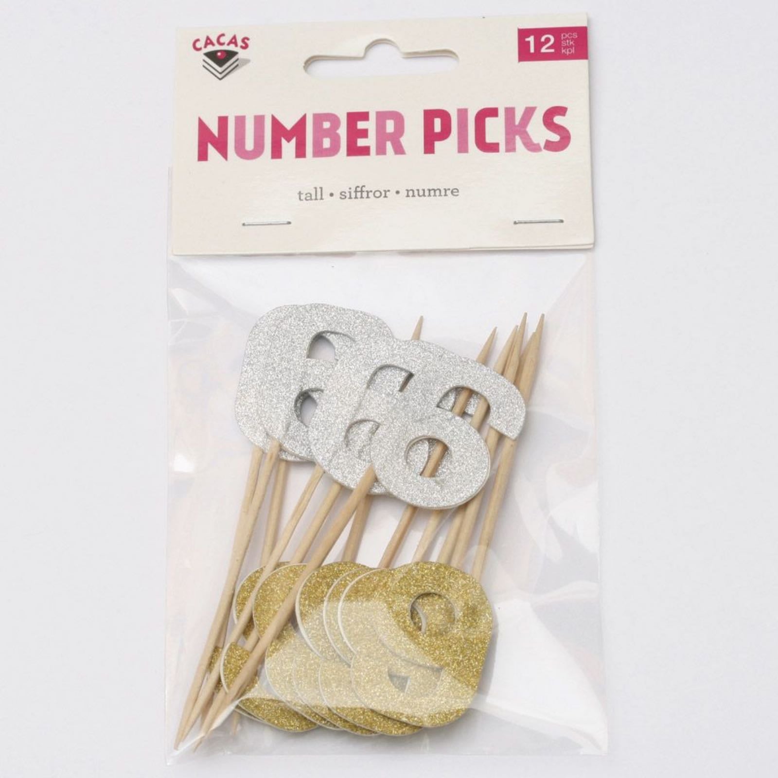 Tall 6 sticks med tall i papp, 12 stk ass Gull/Sølv i pakken.