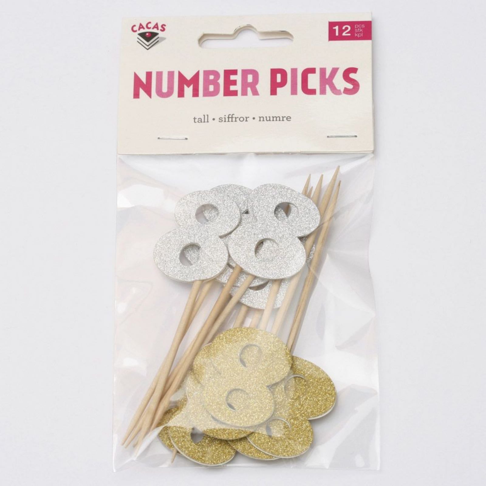 Tall 8 sticks med tall i papp, 12 stk ass Gull/Sølv i pakken.