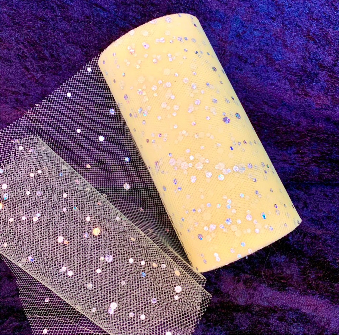Nydelig lys gul tyll med sølvfargede paljetter.